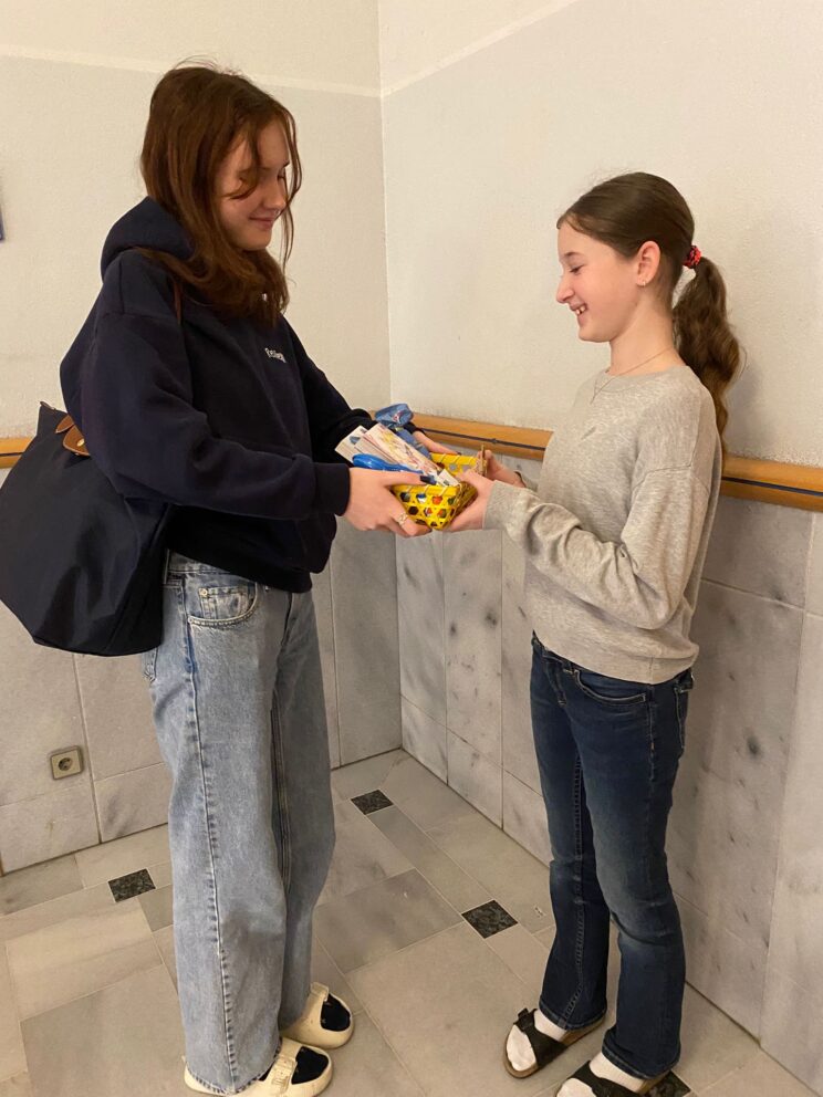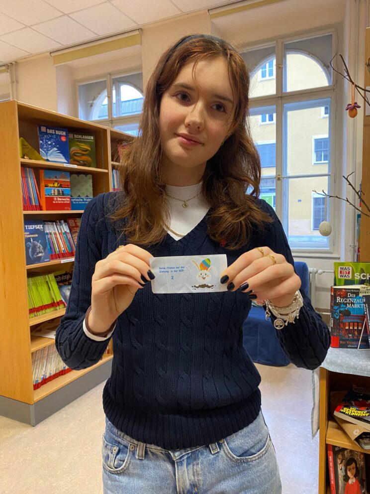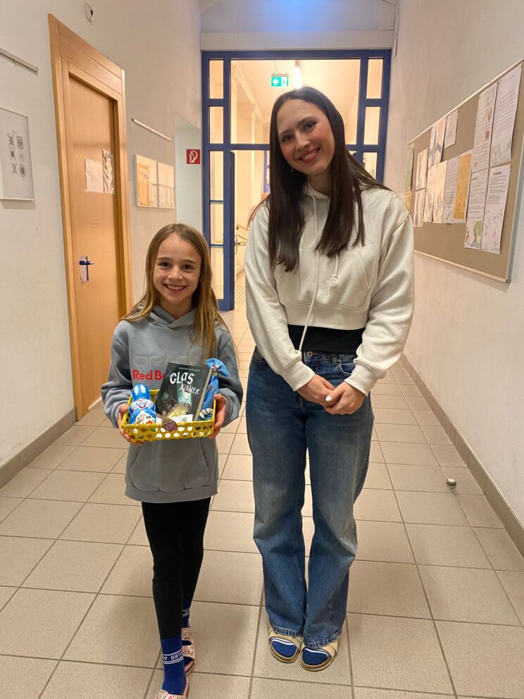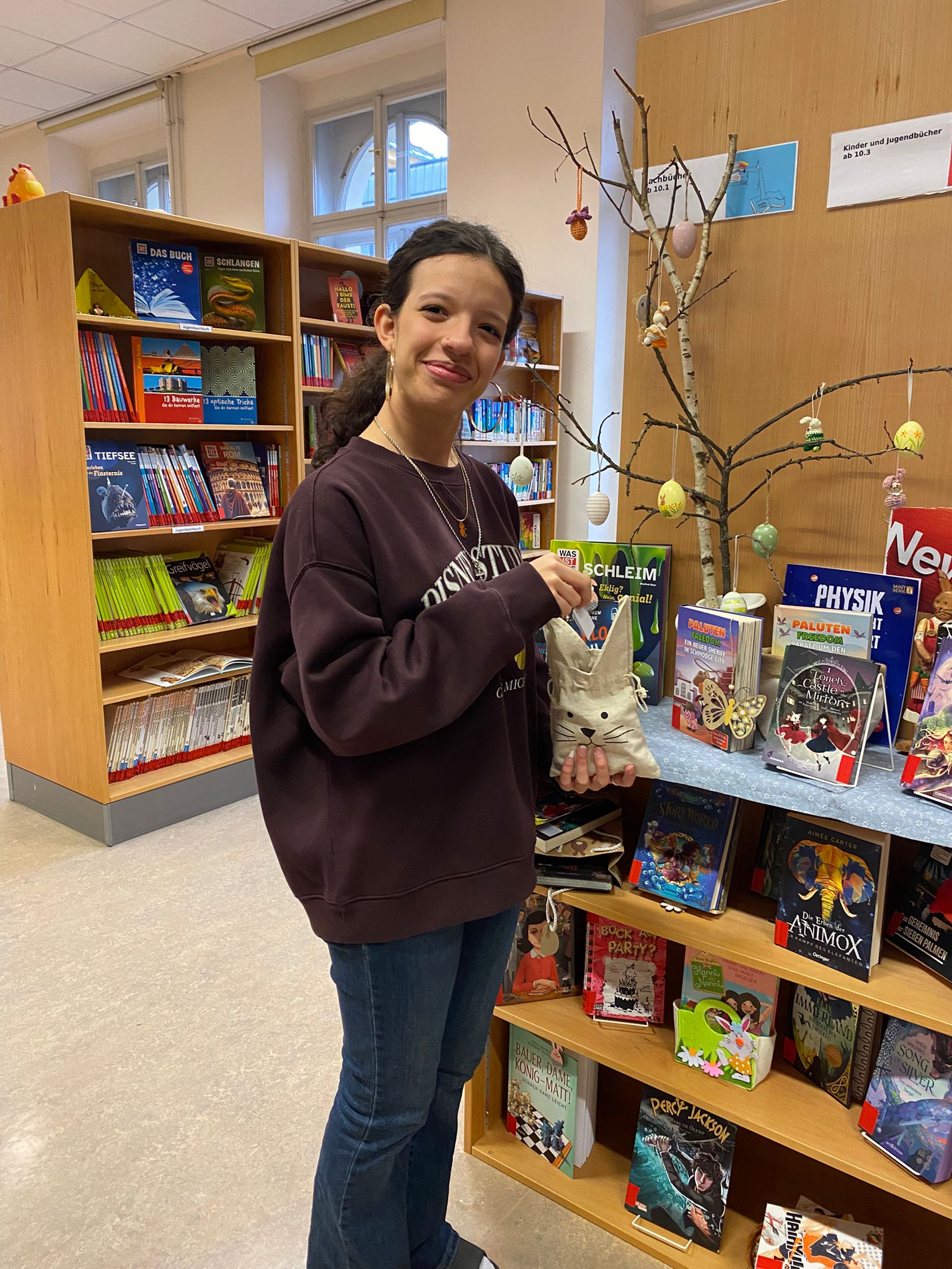 Bei der diesjährigen Ostereier-Suchaktion in der Schulbibliothek hoppelte ordentlich was los: Zahlreiche Kids machten sich auf die Jagd nach den Büchern zu spannenden Textstellen aus aktuellen Jugendwerken. Da wurde geschnuppert, gestöbert und so manches „Ei“ entdeckt, das sich besonders gut versteckt hatte. Am Ende zog der Osterhase bzw. unser BIB-Team höchstpersönlich das große Los: Elina Kruschitz (1D) und Liv Adam (2D) gingen als glückliche Gewinnerinnen hervor. Sie konnten ihre Osternester freudig in Empfang nehmen – mit süßen Leckereien und neuem Lesestoff gefüllt.